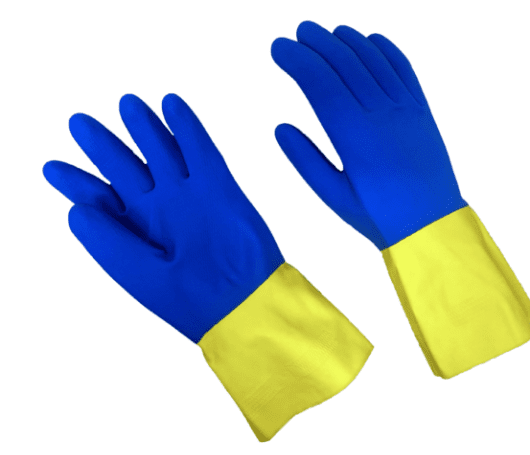 Product Information: LN28 is a neoprene over latex glove with flock lining. • Blue neoprene over yellow latex • Double dipped provides versatile chemical resistance properties of neoprene and comfort of latex • Flock lining • Honeycomb grip