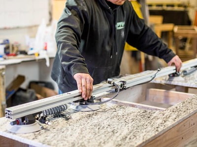 Designed for professional countertop fabricators and installers, the Auto features high-flow vacuum release valves for quick detachment and a VMP750 Rail-Mounted Rechargeable Pump that maintains vacuum pressure automatically for up to 5 hours. An integrated LCD display provides real-time battery and pump status, eliminating guesswork and reducing downtime.