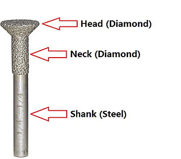 - 1/4" Shank Diameter (Steel) x 3/16" Neck Diameter (Diamond) x 7/16" Head Diameter (Diamond)