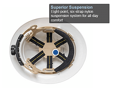 - Eight-point, six-strap nylon suspension is comfortable yet provides exceptional impact absorption.