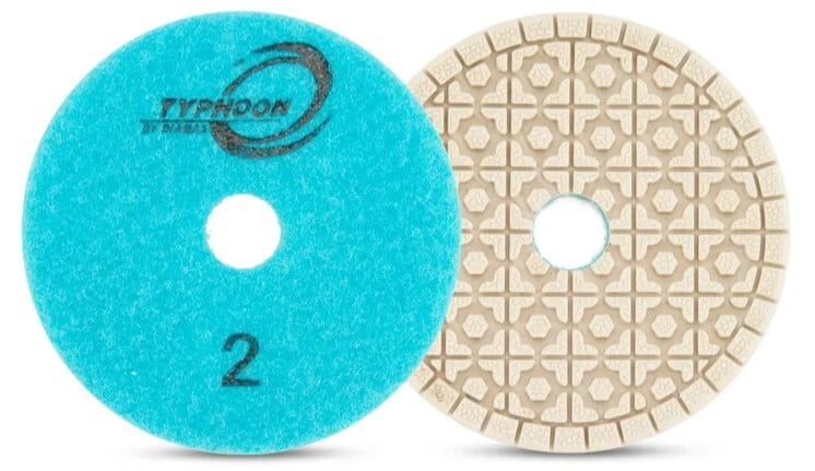Typhoon 3 Step wet polishing pads feature non-marking white resin and a new clover style tread pattern. The clover pattern was designed to provide better water retention during the polishing process. The Typhoon pad is also very flexible with rounded edges to prevent accidental scratches.