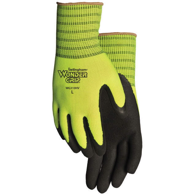Be safe and be seen with the Bellingham WG310HV. This glove features a high-visibility 13- gauge polyester knit liner. Its Wonder Grip® palm coating offers great grip & fit with less hand fatigue during use. Durable, breathable, hi-vis 13-gauge seamless polyester knit liner. Double-coated textured Wonder Grip® Latex palm. Excellent grip, wet or dry.