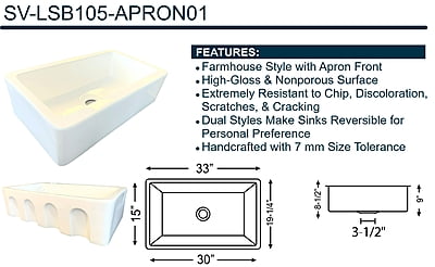 - Overall Dimensions: 33" x 19-1/4" x 9" (including drain)