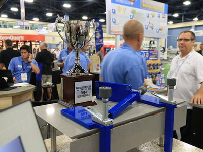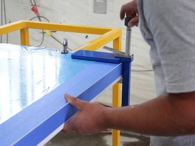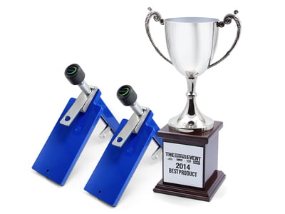 The Omni Cubed Miter-It™ Original Lamination Clamp is an innovative jig that simplifies miter laminations by allowing finished-side-up gluing. This eliminates the need to flip heavy stone pieces, keeping the seam visible while improving worker safety and protecting valuable material.