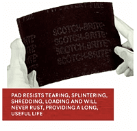 Scotch-Brite™ pads won't shred during use, rust after use, or create fine metal splinters. The nonwoven, open web material resists loading and can be used dry, with water or solvents, and rinsed clean for reuse. This multipurpose 6 x 9" (15 x 23 cm) pad can be used by hand for precise control, with a hand pad block for uniform finishing, or on an in-line sander to cover large areas.