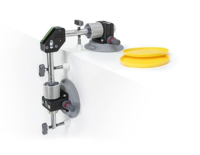 For precision control, knurled rollers and fine-tune levelers allow installers to dial in exact angles, while the integrated counter-pressure leveler helps eliminate lower outswing on vertical pieces. Easy-to-read vacuum indicators make monitoring simple, and the re-pumpable cups maintain pressure without removal.