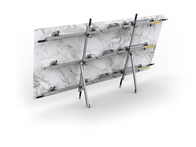The S3 | Slim Slab Saver™ is a versatile, fully customizable rigid frame and reinforcement system that reduces strain and risk of injury while handling large format slabs and other fragile materials. Ideal for LFTM, gauged or thin porcelain slabs, and sintered stone, it prevents breakage during transport and installation. The combination of solid machined clamps and extruded aluminum rails minimizes flexing and twisting while maintaining lightweight strength and extreme rigidity.