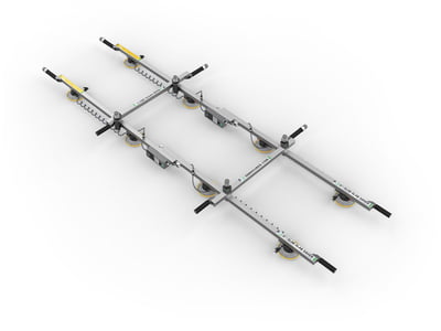 Each Rigid Cross-Brace clamp includes an integrated resting foot to protect finished surfaces. Horizontal Handle with Leveler Leg Kit ensures upright panels are level during wall installation, and UV-resistant foam grips provide ergonomic handling. Rails extend from 63”–126” (160–312 cm), with each rail rated to handle 200 lb (90 kg). Auto models include the VMP750 rail-mounted rechargeable pump, offering automated vacuum pressure maintenance, making the system faster, safer, and more convenient than manual operation.