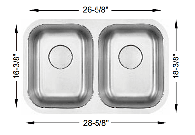 Measuring 28-5/8" × 18-3/8" × 8" overall with 26-5/8" × 16-3/8" × 8" inside dimensions, it provides versatile double-bowl functionality while fitting comfortably into a 36" base cabinet.